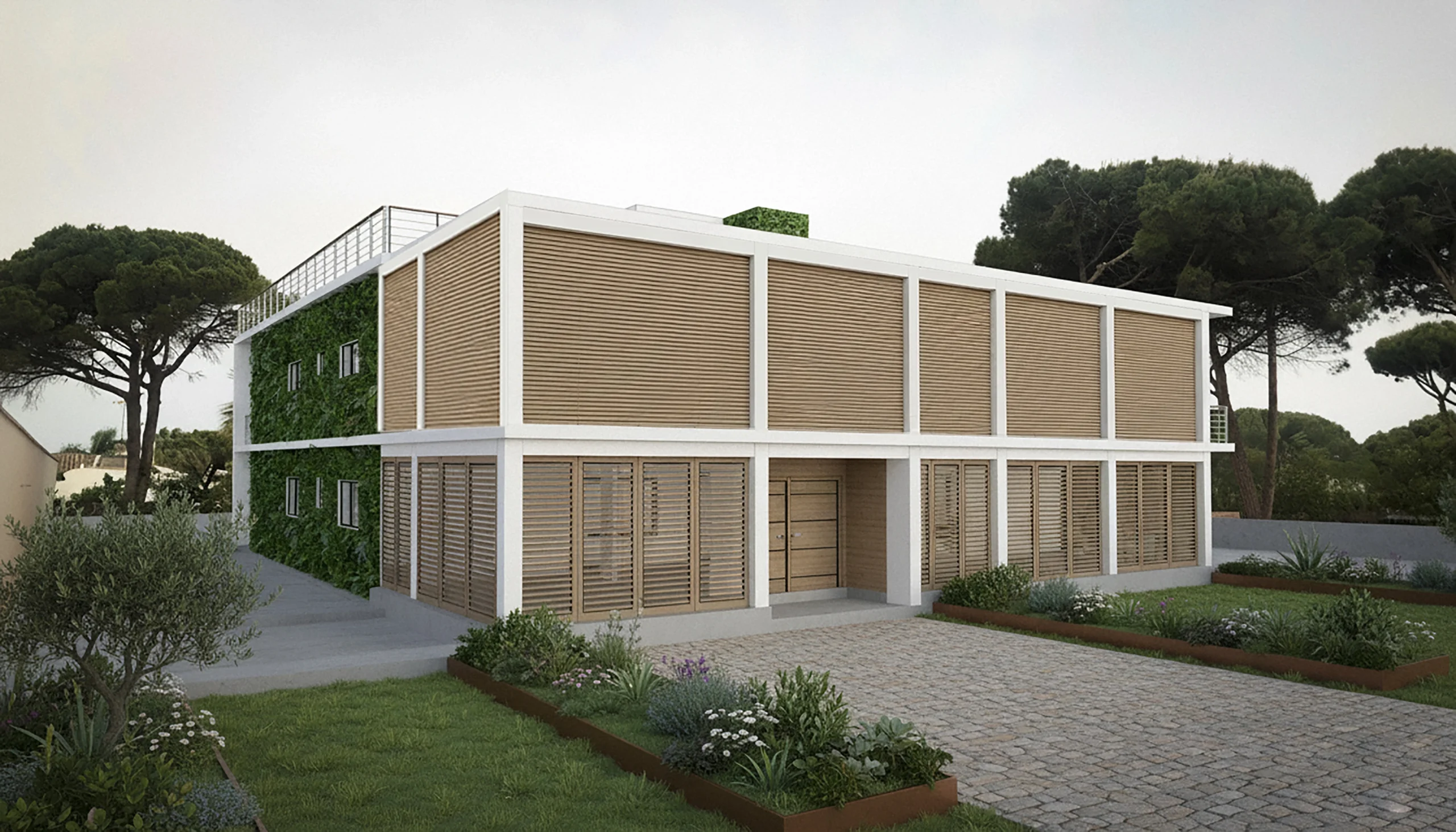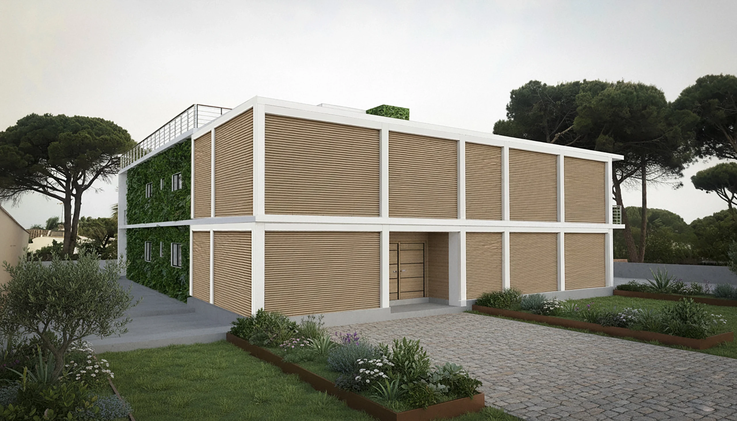 El Chalet Progresivo integra una estructura mixta de hormigón y ladrillo con una doble cubierta de madera, complementada por una envolvente ventilada y paredes verdes bioclimáticas que optimizan la regulación térmica natural. El sistema de cerramientos y ventanas ha sido concebido como una doble piel protectora, capaz de adaptarse a futuras ampliaciones sin comprometer la coherencia volumétrica original. Este enfoque modular y progresivo convierte la vivienda en un ejemplo de bioarquitectura aplicada al clima mediterráneo costero, donde eficiencia energética, flexibilidad y continuidad formal se fusionan en un diseño pensado para evolucionar con el tiempo. La fachada principal, orientada al este, determina la estrategia bioclimática: para mitigar la intensa radiación solar matutina, los cerramientos funcionan como barrera protectora, integrándose de manera armoniosa durante las fases de crecimiento de la vivienda.